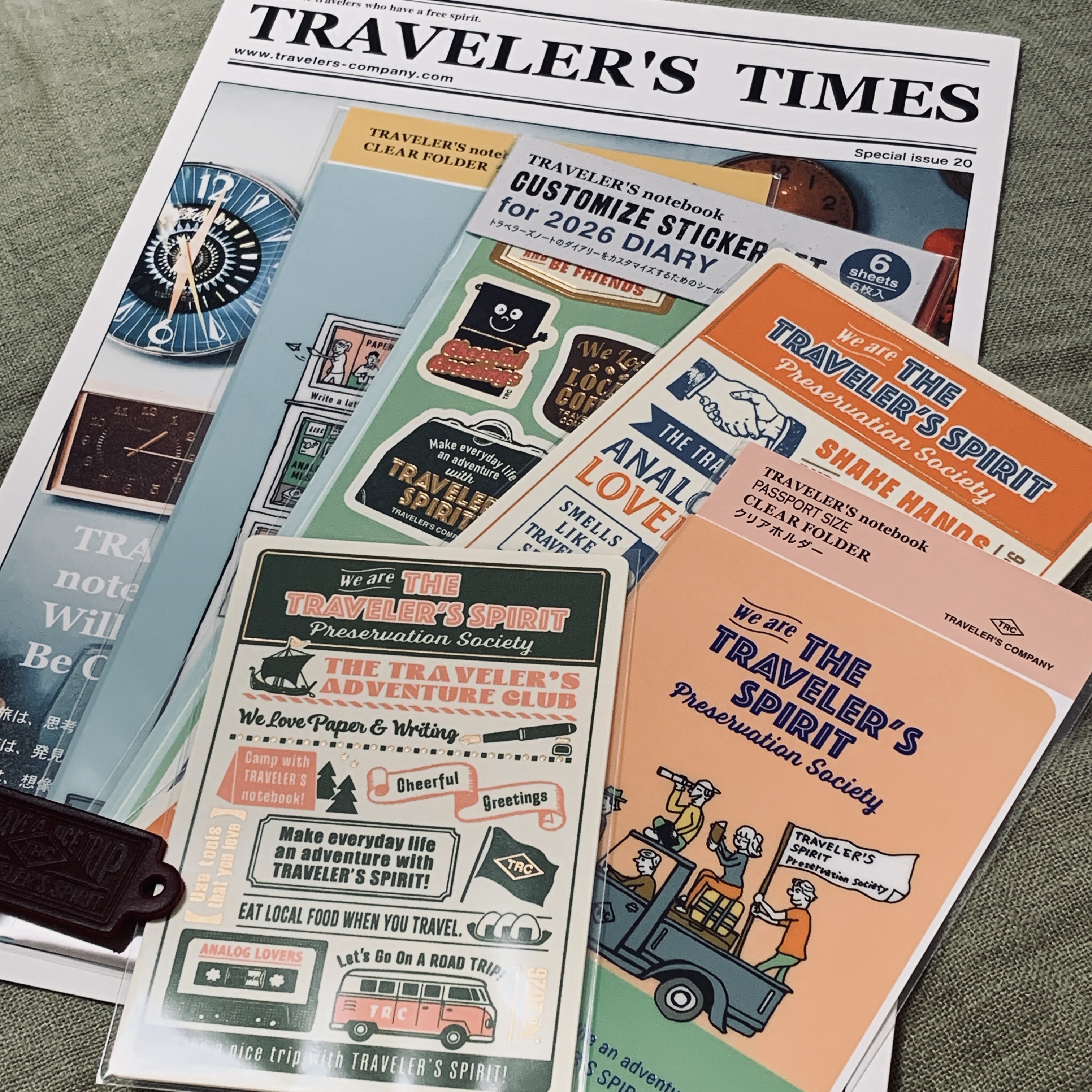 ということで、毎年恒例『トラベラーズカンパニー』のトラベラーズノート限定タグ、2026下敷き、2026クリアファイルなどを入手しましたー!今年のテーマもセンス良くてかわいい。